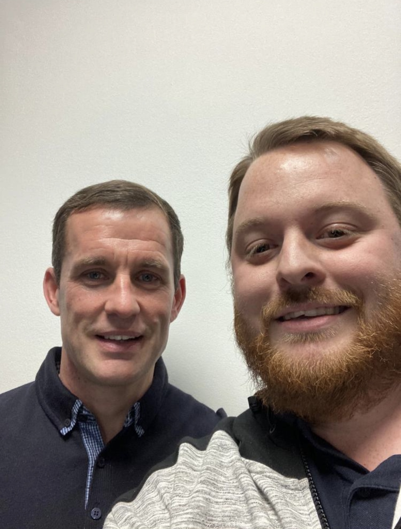 Russ (in a cupboard) with our 2016/17 League two winning captain Michael Doyle.